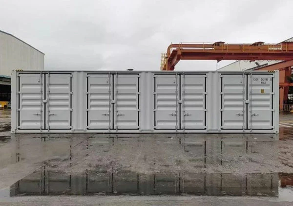 Contenedor High Cube nuevo de 40 pies (12m) "one-trip" con 4 puertas de acceso en el lateral derecho. Acero Corten, suelo contrachapado marino, cajas de seguridad. Ideal para carga/descarga lateral fácil.