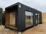 Módulo prefabricado «Dalí» de 24m² (8x3m), ref. 21900. Espacio diáfano versátil con aseo. Revestimiento exterior en acero plegado negro mate. Ideal para oficina, estudio, showroom.